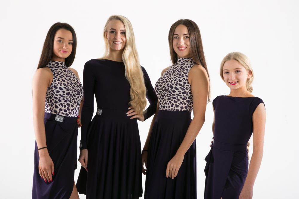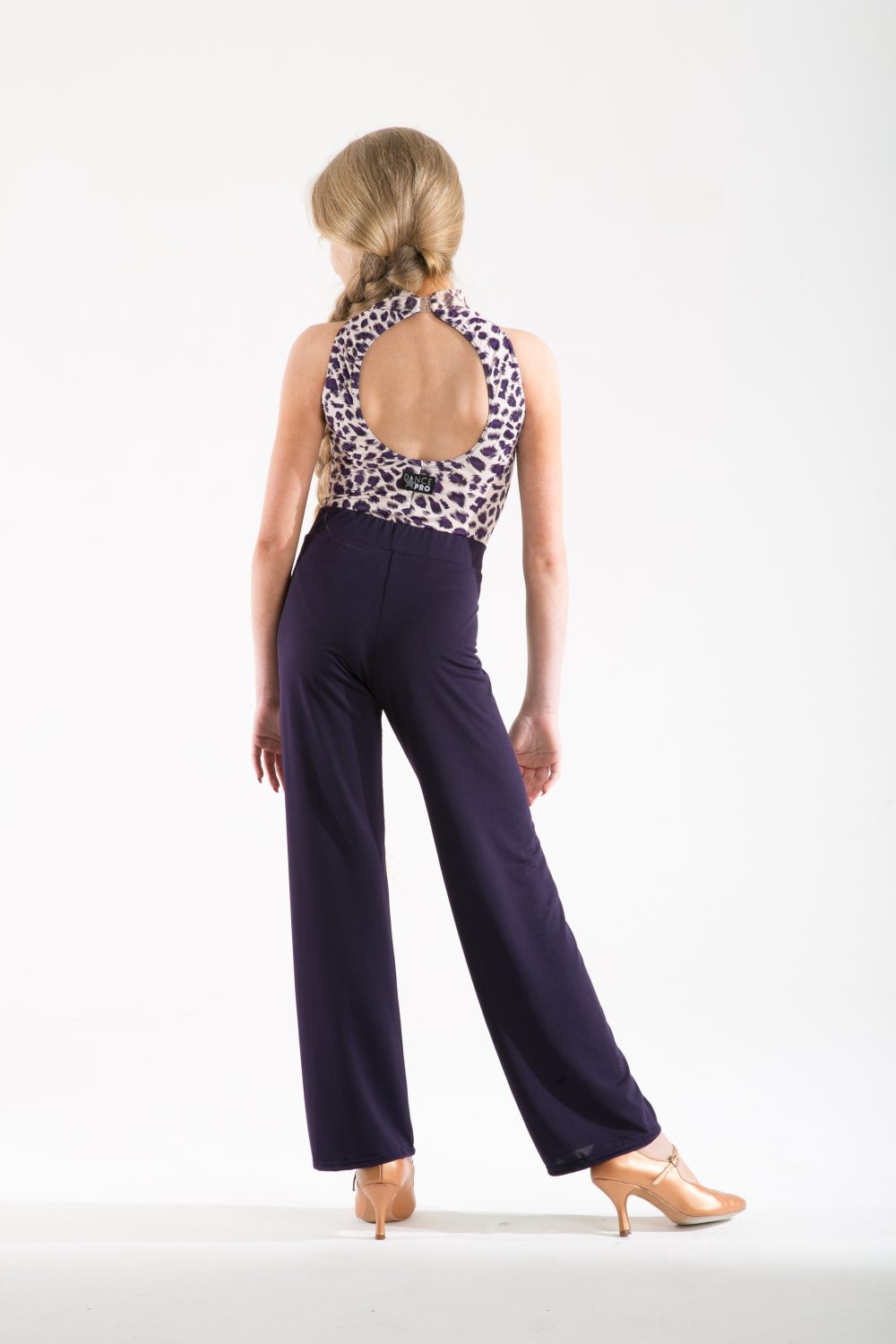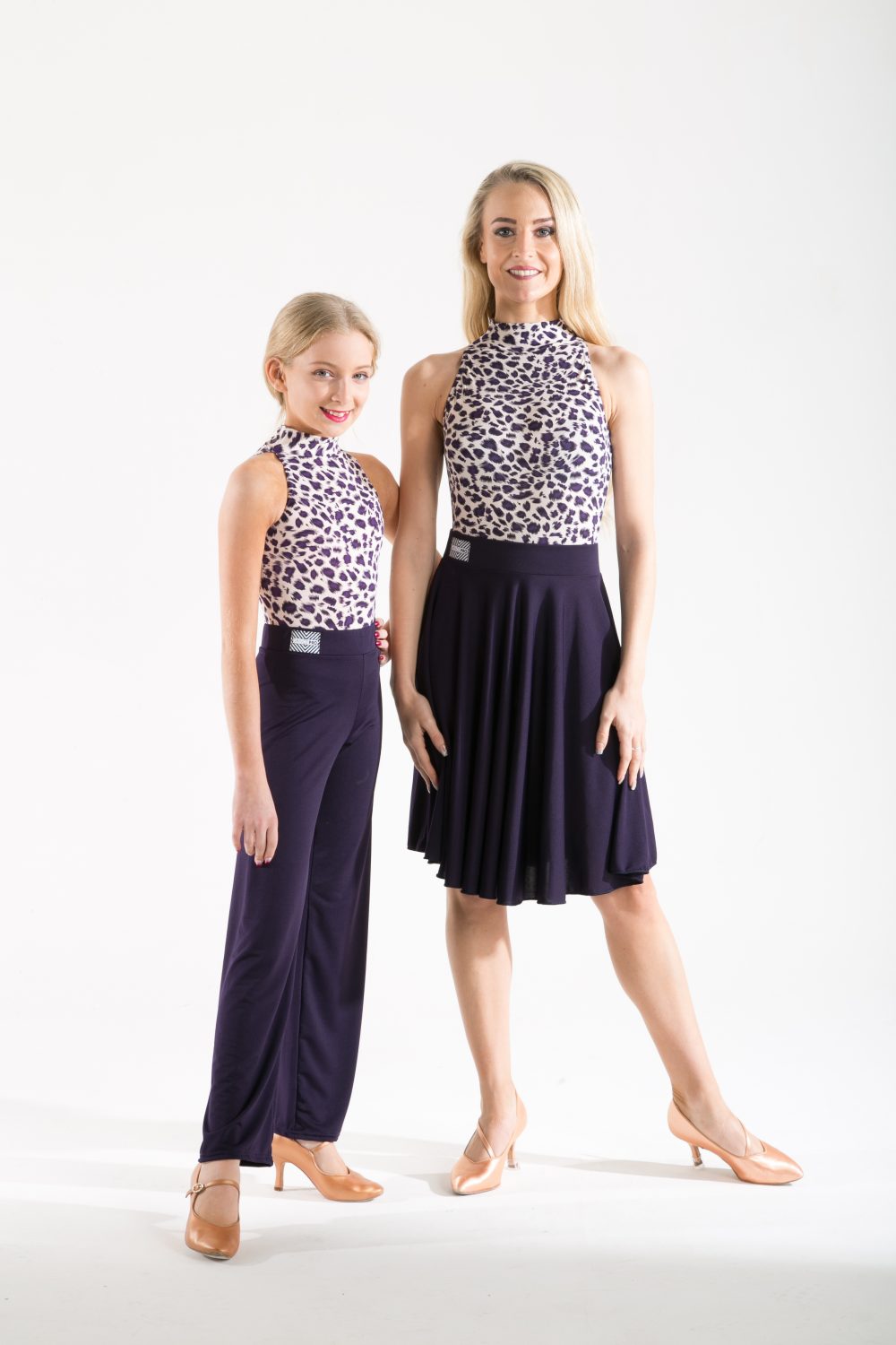 This stunning T-Neck, Keyhole Leotard in purple leopard print Lycra is a great addition to mix with our aubergine Crepe Skirts and Trousers.